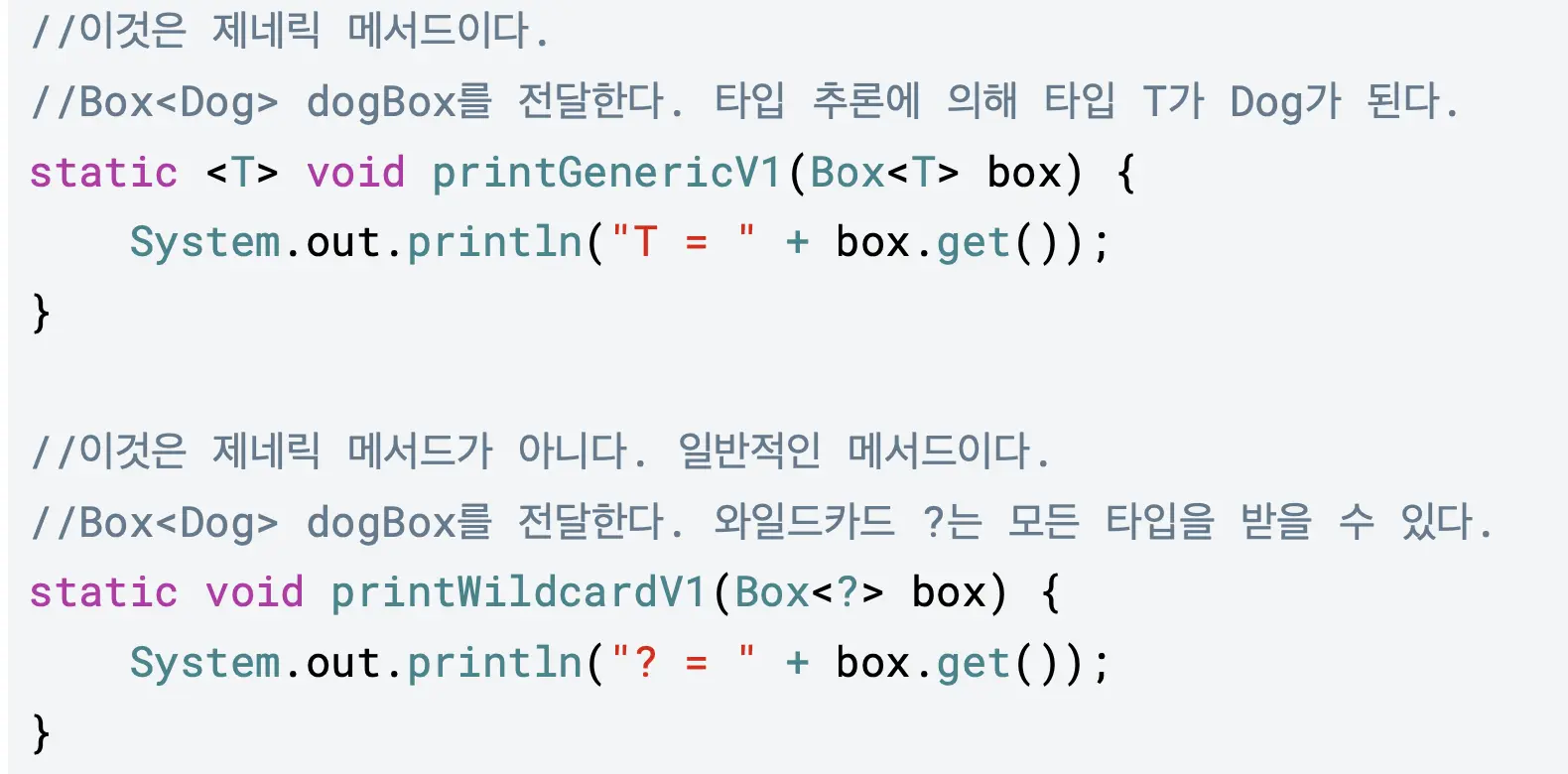와일드카드는 제네릭 타입, 제네릭 메서드를 선언하는 것이 아니다. 와일드카드는 이미 만들어진 제네릭 타입을 활용할 때 주로 사용한다.