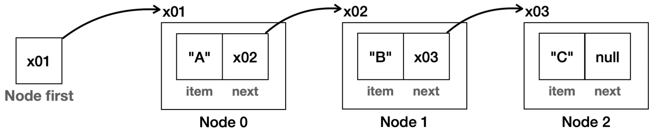 링크드 리스트에 A → B → C 순서로 저장한 경우의 개념도